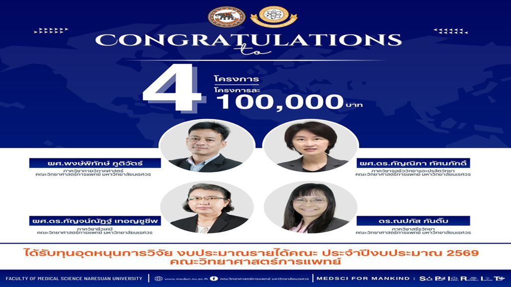 คณะวิทยาศาสตร์การแพทย์ มหาวิทยาลัยนเรศวร ขอแสดงความยินดีกับ บุคลากรสายวิชาการ ที่ได้ได้รับทุนอุดหนุนการวิจัย งบประมาณรายได้คณะ ประจำปีงบประมาณ 2569 คณะวิทยาศาสตร์การแพทย์