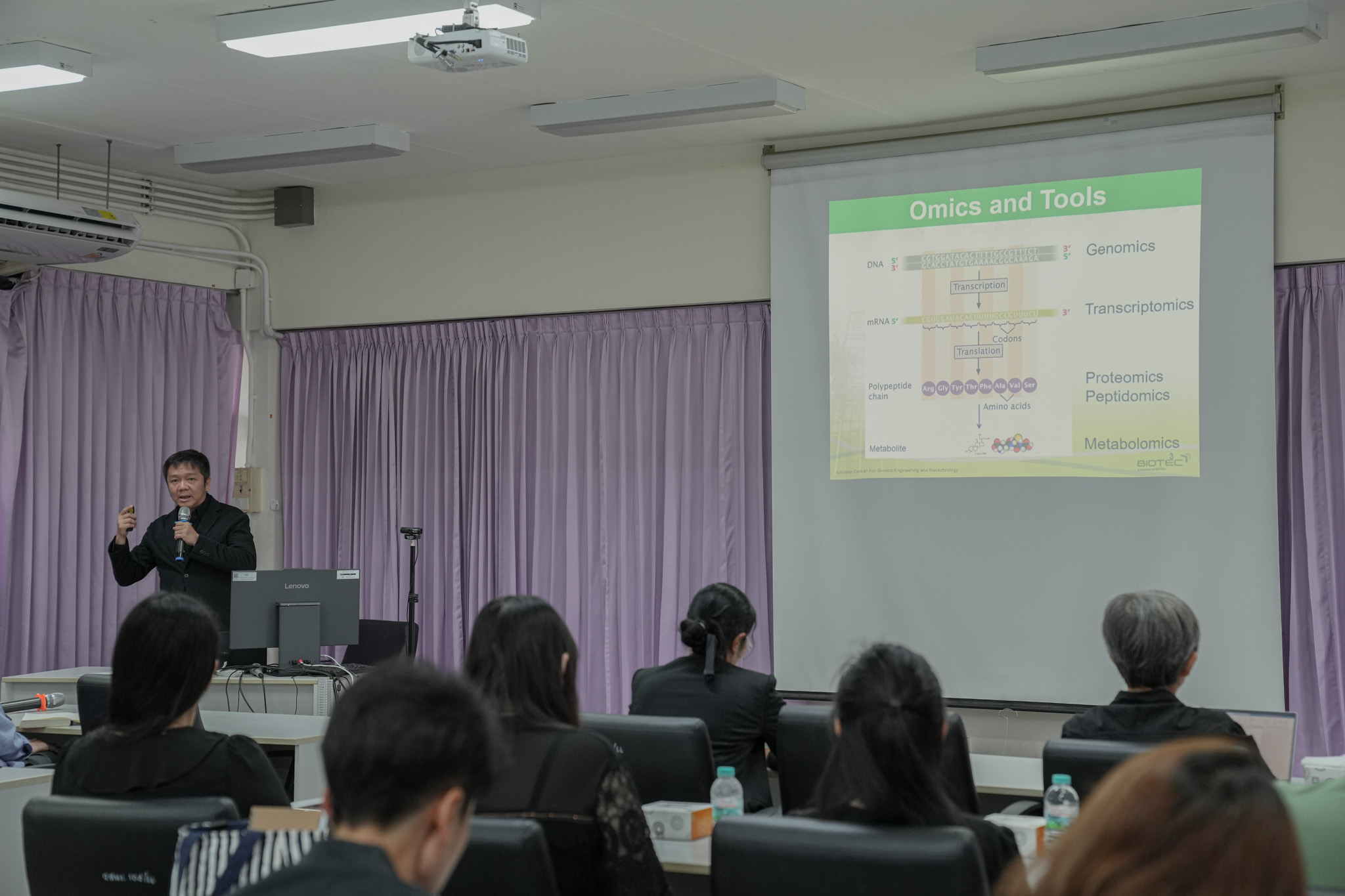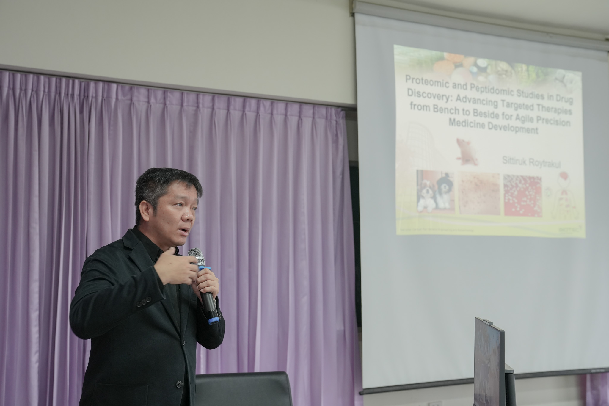 วันที่ 4 พฤศจิกายน 2568 หน่วยวิจัย ร่วมกับภาควิชาสรีรวิทยา คณะวิทยาศาสตร์การแพทย์ ได้จัดเสวนางานวิจัย หัวข้อ “Proteomic and peptidomic studies in Drug Discovery: Advancing Targeted Therapies from Bench to Bedside for Agile Precision Medicine Development” โดยได้รับเกียรติจาก ดร.สิทธิรักษ์ รอยตระกูล (ศูนย์พันธุวิศวกรรมและเทคโนโลยีชีวภาพแห่งชาติ (BIOTEC) มาเป็นวิทยากรบรรยายในครั้งนี้