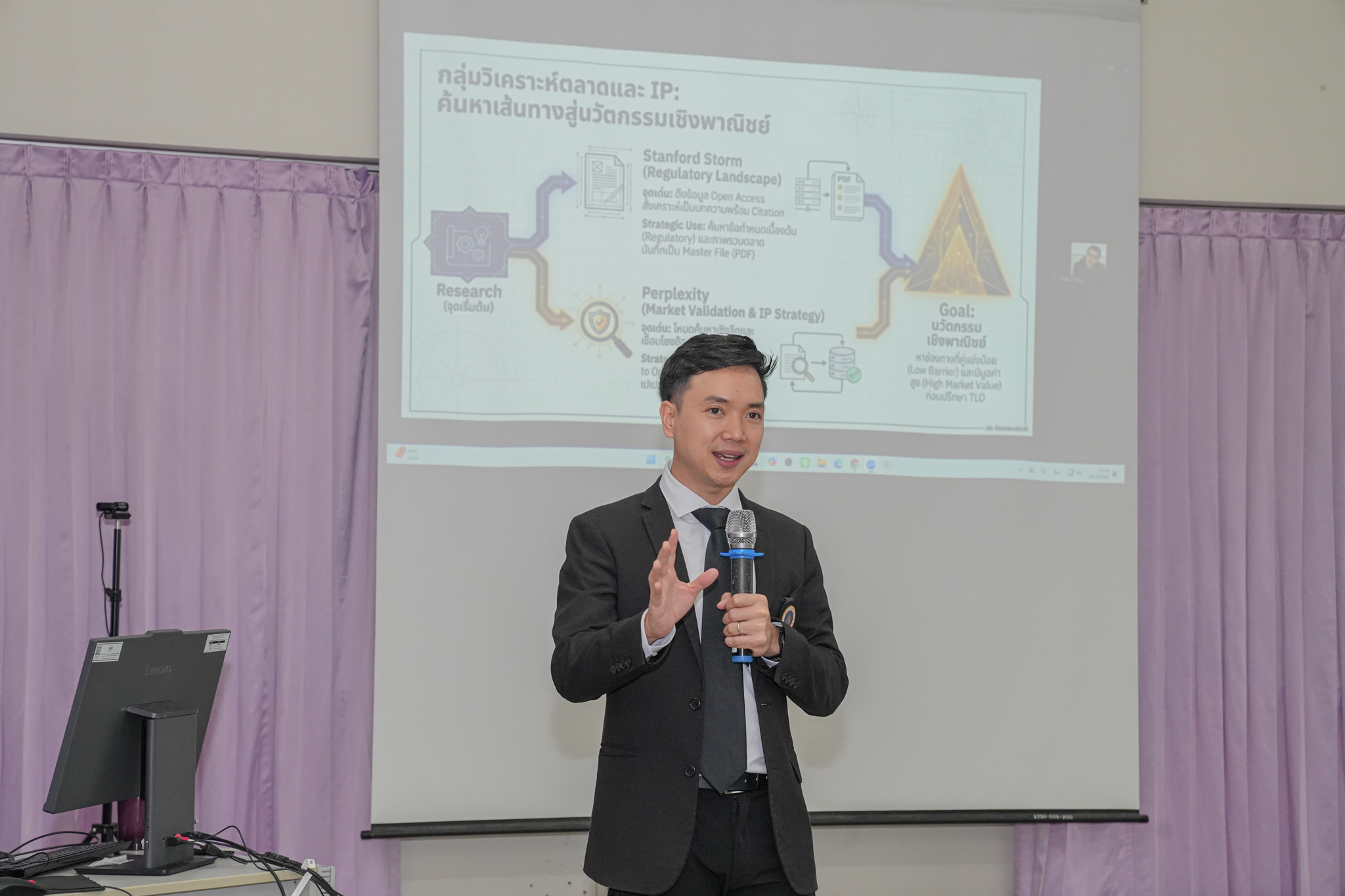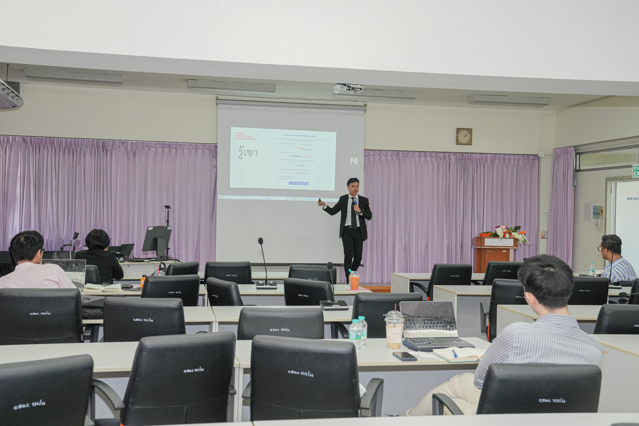 ซึ่งได้รับเกียรติจาก ดร.วนรักษ์ ชัยมาโย (นักบริหารงานวิจัย งานบริหารข้อมูลและเผยแพร่งานวิจัย กองบริหารงานวิจัย มหาวิทยาลัยมหิดล) มาบรรยาย ในหัวข้อ “Strategizing Research & Innovation with Data & AI” การอบรมนี้มุ่งเสริมศักยภาพนักวิจัยและผู้บริหารในการใช้ข้อมูลและ AI เพื่อสนับสนุนการวางยุทธศาสตร์ด้านวิจัยและนวัตกรรมอย่างเป็นระบบ โดยใช้ Scopus และ SciVal วิเคราะห์ศักยภาพองค์กรและตำแหน่งเชิงเปรียบเทียบ ควบคู่กับ Stanford STORM, Consensus และ Perplexity เพื่อสังเคราะห์ทางเลือกเชิงยุทธศาสตร์